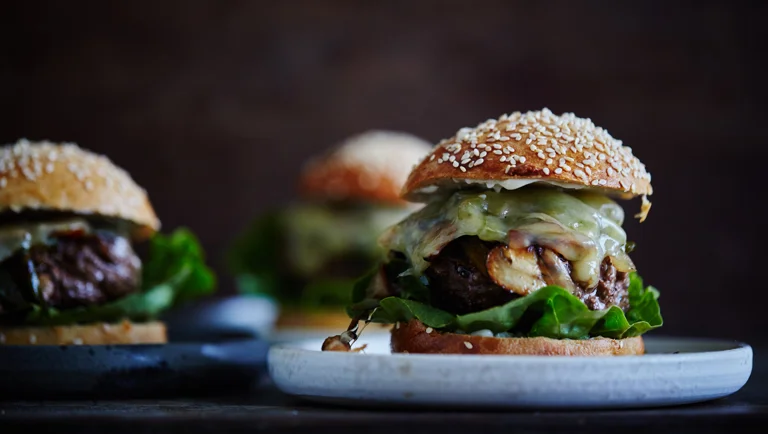 - Bieten Sie Ihren Gästen Abwechslung, indem Sie die Steak-Arten oder die -Grammatur variieren. Es empfiehlt sich, diesen Burger mit Messer und Gabel zu servieren.