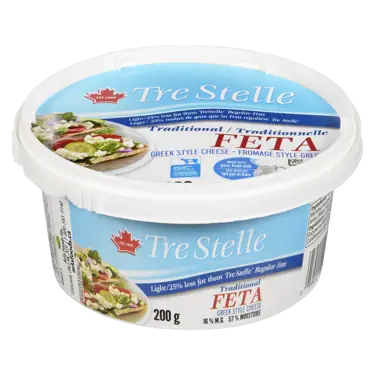 ID: 48402 12x200 gTre Stelle Light Feta Cheese is a delicious and flavorful option that doesn't compromise on taste. Made with from 100% Canadian Dairy, and with high-quality ingredients, this feta cheese offers a smooth and crumbly texture with a tangy and salty flavor. The light version of Tre Stelle Feta Cheese provides a delightful taste with a lighter twist. It's perfect for adding a touch of Mediterranean goodness to salads, wraps, or as a flavorful topping for roasted vegetables. Whether you're looking for a lighter option or simply want to enjoy the classic taste of feta, Tre Stelle Light Feta Cheese is a fantastic choice.