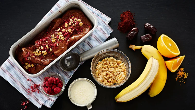 - Place the bananas, cocoa, dates, cream and orange juice in a food processor and whizz until you have a delicious and creamy chocolate soft-serve ice cream. Add orange zest to taste.