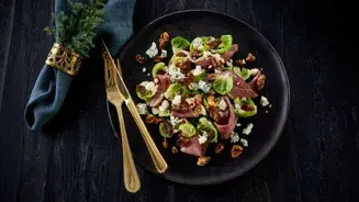 Plat : Magret de canard fumé aux choux de Bruxelles, fromage bleu et noix rôties